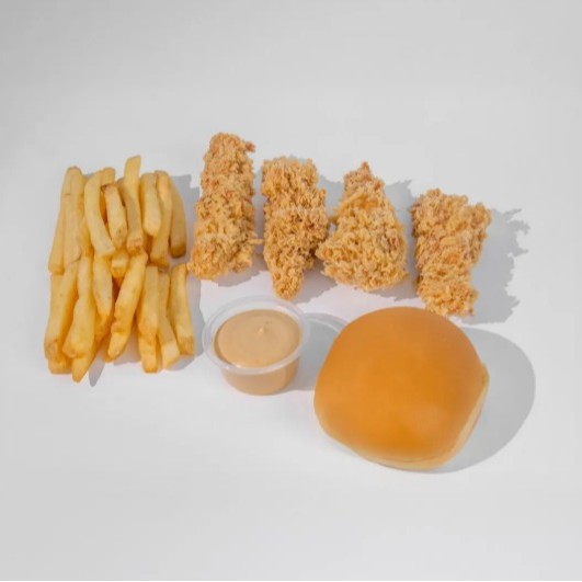 (714 سعرة حرارية)أربعة أصابع دجاج مقرمشة مع صوص السقنتشر، بطاطس مقرمشة وخبز برجر مع كل لقمة من القرمشة والنكهة الغنية.
